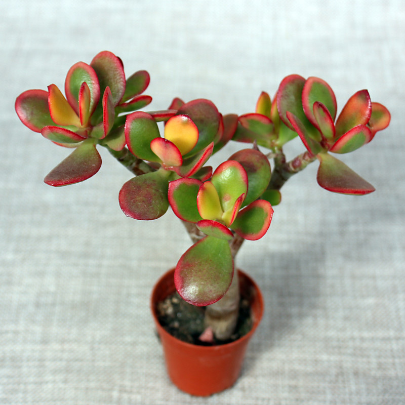 Синоним Crassula оvata 'Sunset', Crassula 'Golden Jade'. Декоративный сорт толстянки овальной с ярко окрашивающимися на сильном солнце и в прохладе листьями. При недостатке освещения отличить ее от обычной толстянки овальной нельзя. Хорошо растет. В продаже ветвистые черенки 12-15 см.