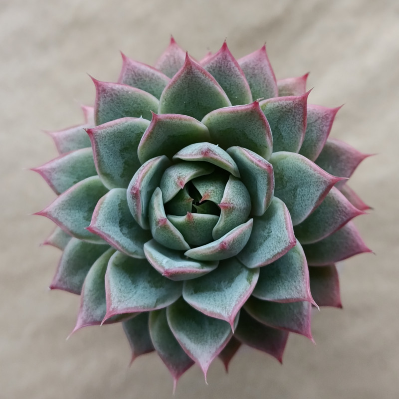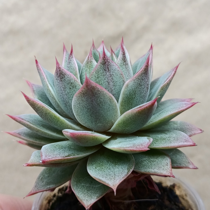 Красивая эхеверия с острыми тонкими листьями, собранными в плотную розетку. Цвет розетки зелёный, каёмка листиков красная. С внешней стороны красноватые крапинки, сгущаются к кончику листа. Красиво смотрится по несколько розеток рядом.