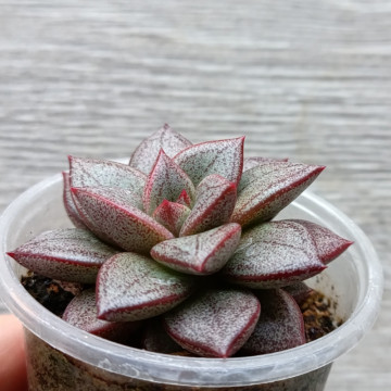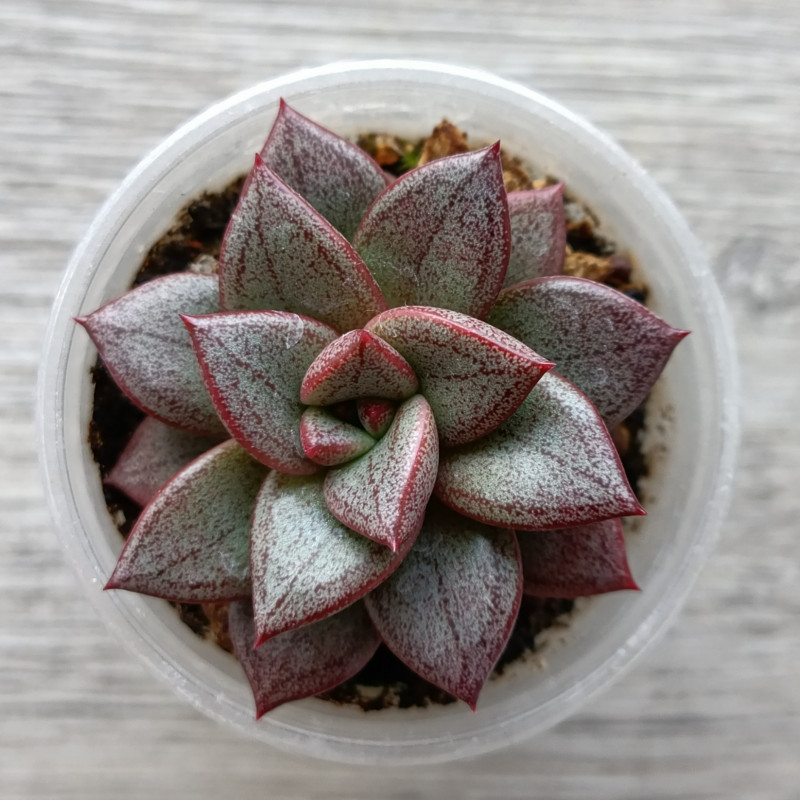 Красивая эхеверия с глянцевыми, мясистыми листьями. Цвет листьев от зелёного до красно-бордового, в крапинку. Каёмка листа более насыщенного цвета, по середине листа идёт красная линия. Листья чуть закручены по спирали.