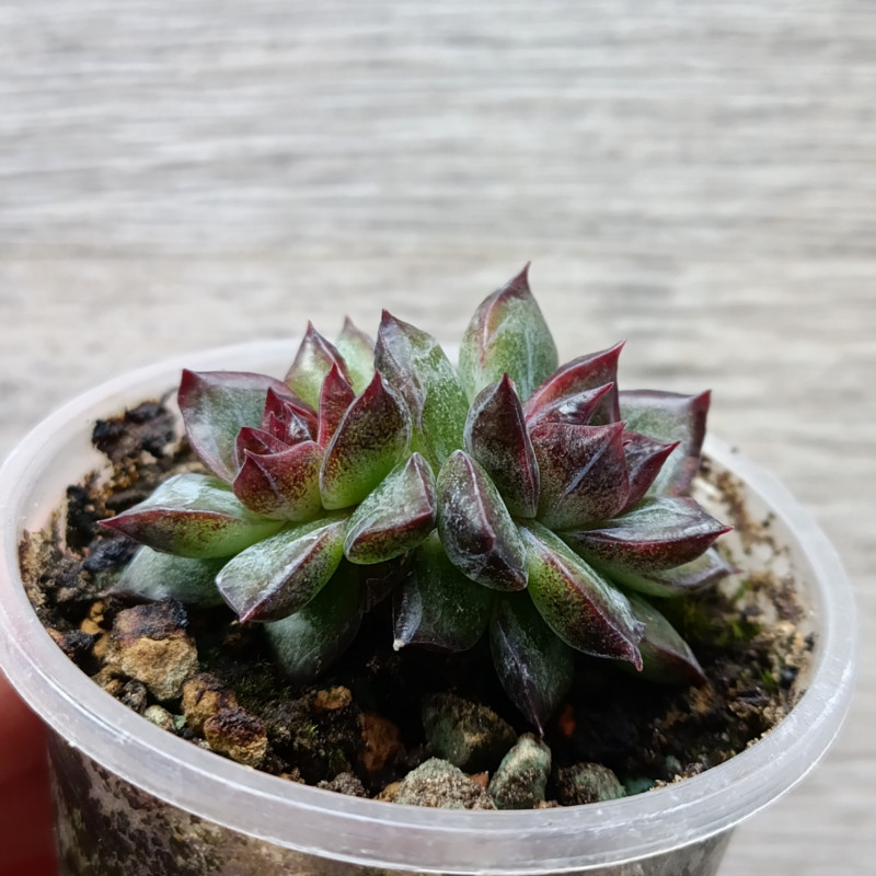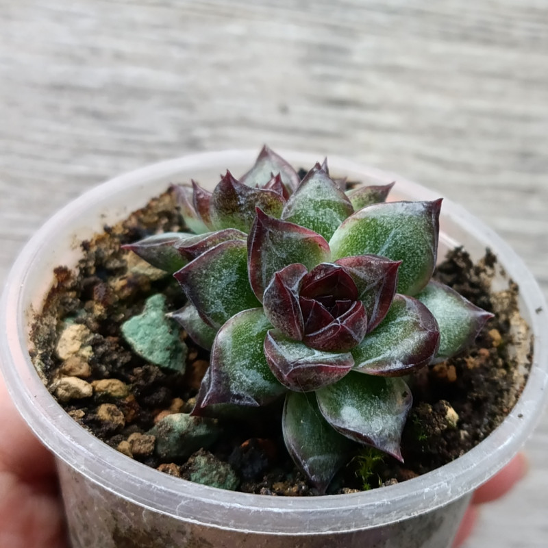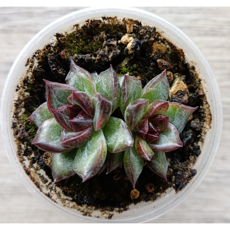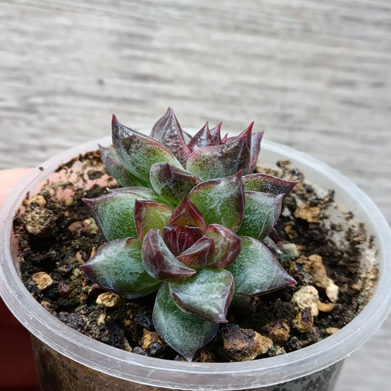 Эхеверия с листьями тëмно-зелёного цвета. Середина розетки и кончики листьев окрашиваются в темно-фиолетовый цвет. Листики мясистые, плотные.
