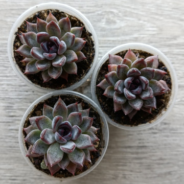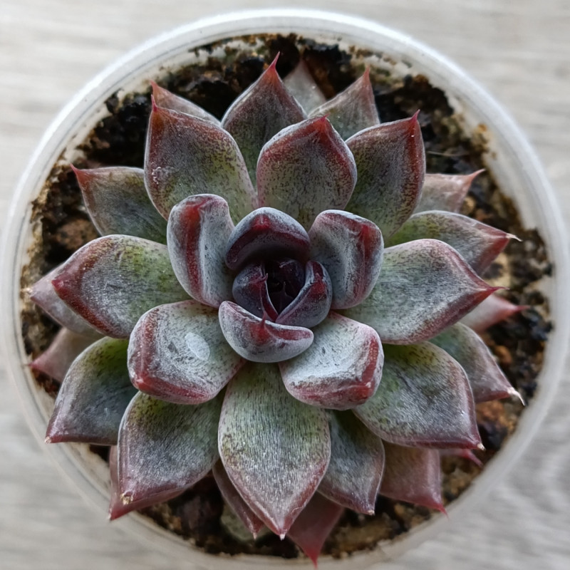 Эхеверия с классической розеткой из мясистых, узких листочков. Середина розетки темно-сиреневая. Лист окрашен черничными крапинками-штрихами, более насыщенно к краям. Розетка не склонна к вытягиванию. Также продается под названием Black Pearl.