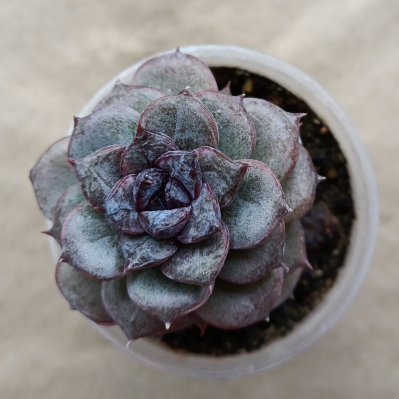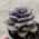 Эхеверия с мясистыми плотными листиками. Цвет листа неоднородный зелёный с фиолетовыми штрихами. К кончику листа и в серединке розетки фиолетовый цвет более интенсивный. Иногда на розетках бывают беловатые участки. Розетка аккуратная, плотная, не склонна к вытягиванию.