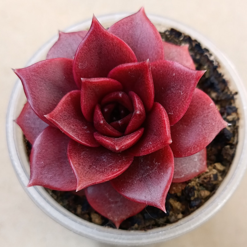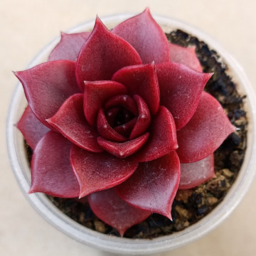 Яркая, красно-коричневая эхеверия с мясистыми листочками. Форма розетки классической формы. Лист заострен, глянцевый, самый кончик листа желтоватого цвета. Не склонна к вытягиванию, хорошо окрашивается. Растение достаточно редкое. Станет украшением любой коллекции.