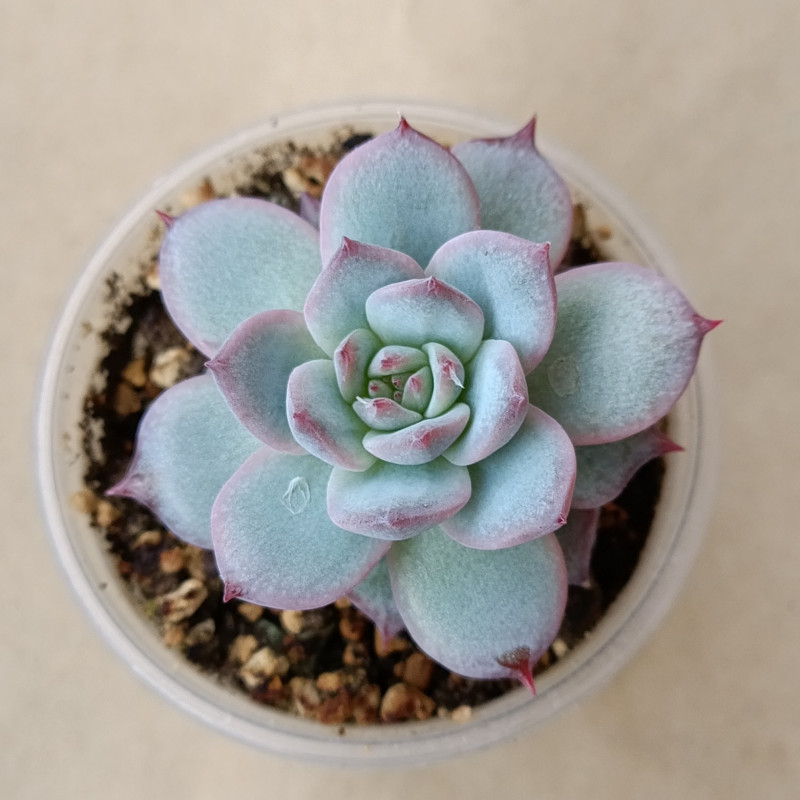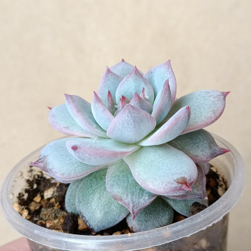 Эхеверия привлекает своей розово-голубой окраской, кончик листа с красной колючкой. Растение нуждается в яркой досветке, бедном грунте и редком поливе, иначе очень быстро вытягивается.