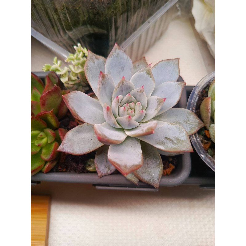 Средняя эхеверия бело-голубых оттенков из-за плотного налета. Листья на конце и колючка слегка розовеют. Склонна к вытягиванию при недостатке света. Цена за розетку от 5 см.