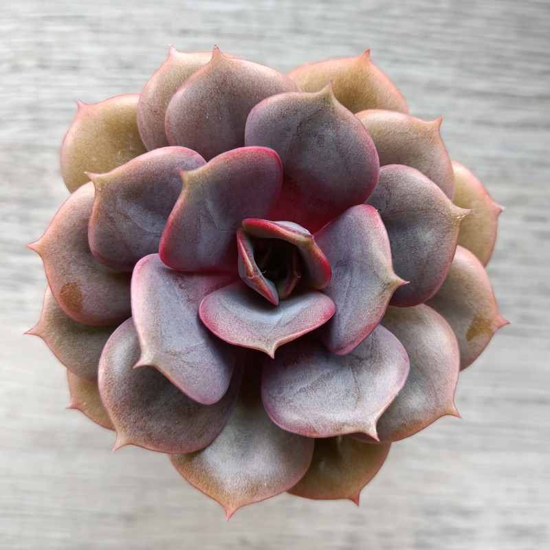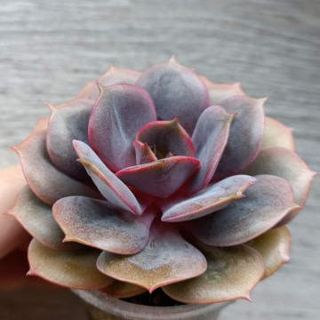 Эхеверия с крупными плоскими листьями округлой формы. Со временем эхеверия становится похожа на бутон, розетка не плотная. Эхеверия приобретает темно-красные оттенки при хорошем освещении.