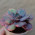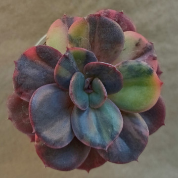Эхеверия с крупными плоскими листьями. Основной цвет эхеверии имеет красно-фиолетовые оттенки, вдоль листа располагаются желтые, зелёные, розовые штрихи и участки.