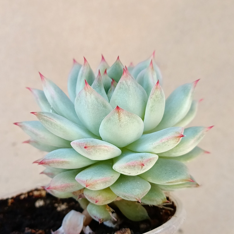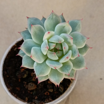 Эффектная небольшая эхеверия светло-салатоаого цвета с красными коготками. Хорошо держит форму розетки, не склонна к вытягиванию.