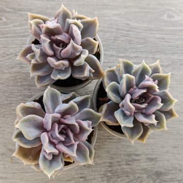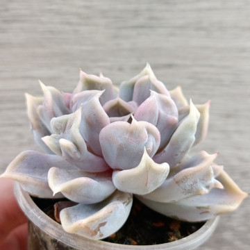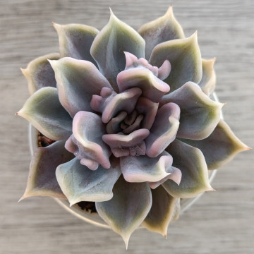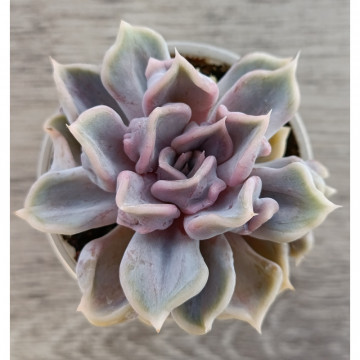 Эхеверия с необычными листиками. С внешней стороны образуются наросты. Чем больше розетка, тем интереснее и больше наросты. Не склонна к вытигиванию. Растёт медленно. Цвет серебристый с розовым отливом.