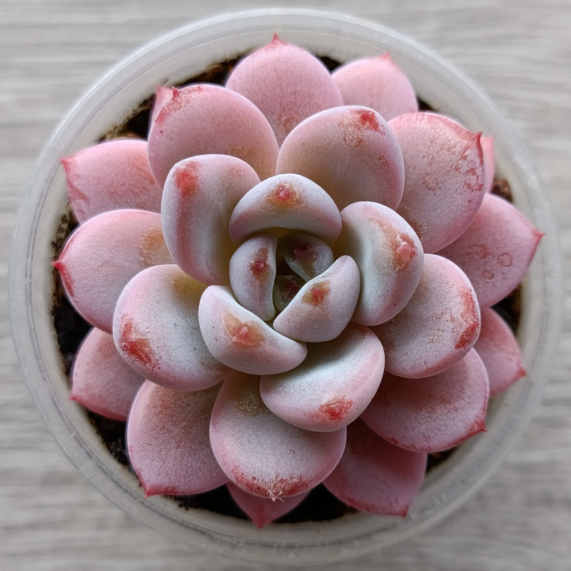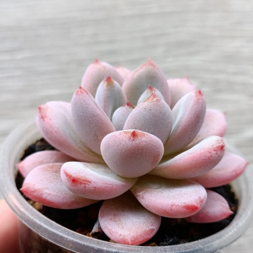 Эхеверия с пухлыми удлинёнными листиками. Цвет розетки голубовато-розовый. К кончику розовый цвет более насыщен. Имеет небольшой налёт. Для плотности розетки и розового цвета нужно хорошее освещение, редкий полив и бедный грунт.