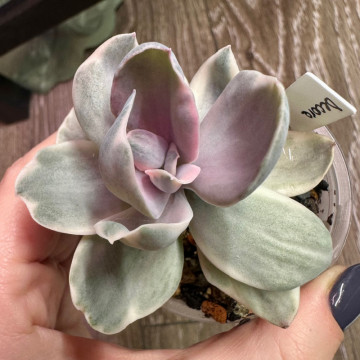 Эффектная вариегатная разновидность эхеверии гиббифлоры металлики. Рыхлооблиственная эхеверия крупных размеров. Листья немногочисленные, округлые. На солнце в бедной почве и при редком поливе розовеет.