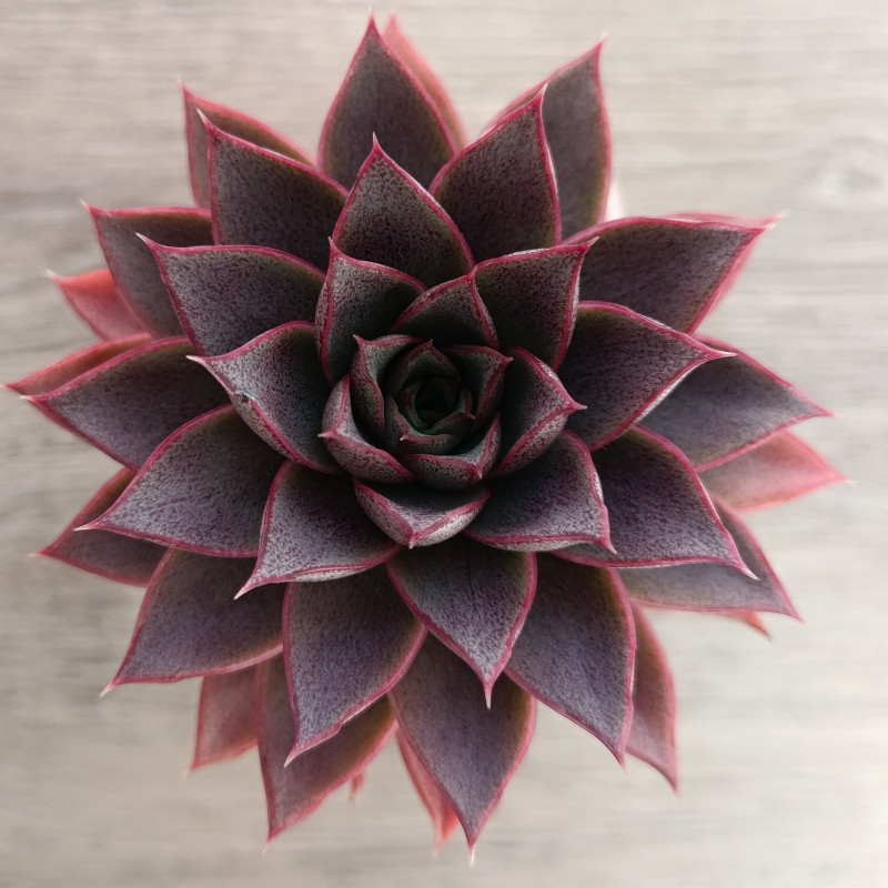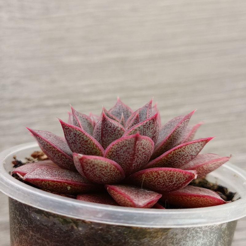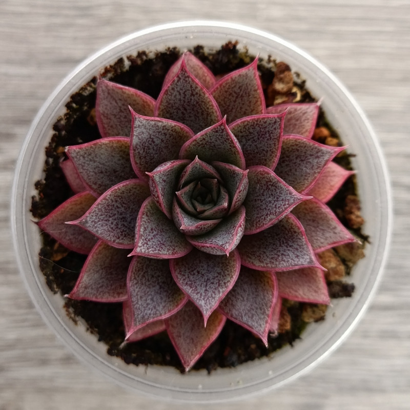 Красивый гибрид эхеверии Пурпузорум. Листья с глянцевым блеском, цвет листьев зелёный с темно-розовым. Каемка ярко-розовая. Чем больше света, тем больше преобладают розовые оттенки ближе к малиновому. Хорошо держит форму, не склонна к вытягиванию.