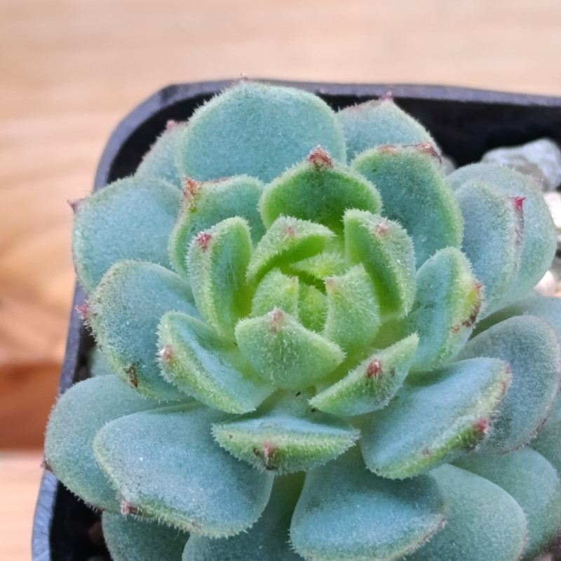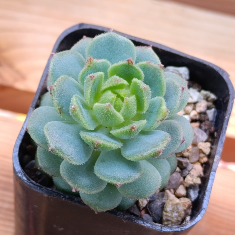 Некрупная эхеверия сочно-зеленого цвета. По краю листа короткие щетинки, по листу тоже есть едва заметное опушение. На свету кончики листьев краснеют.