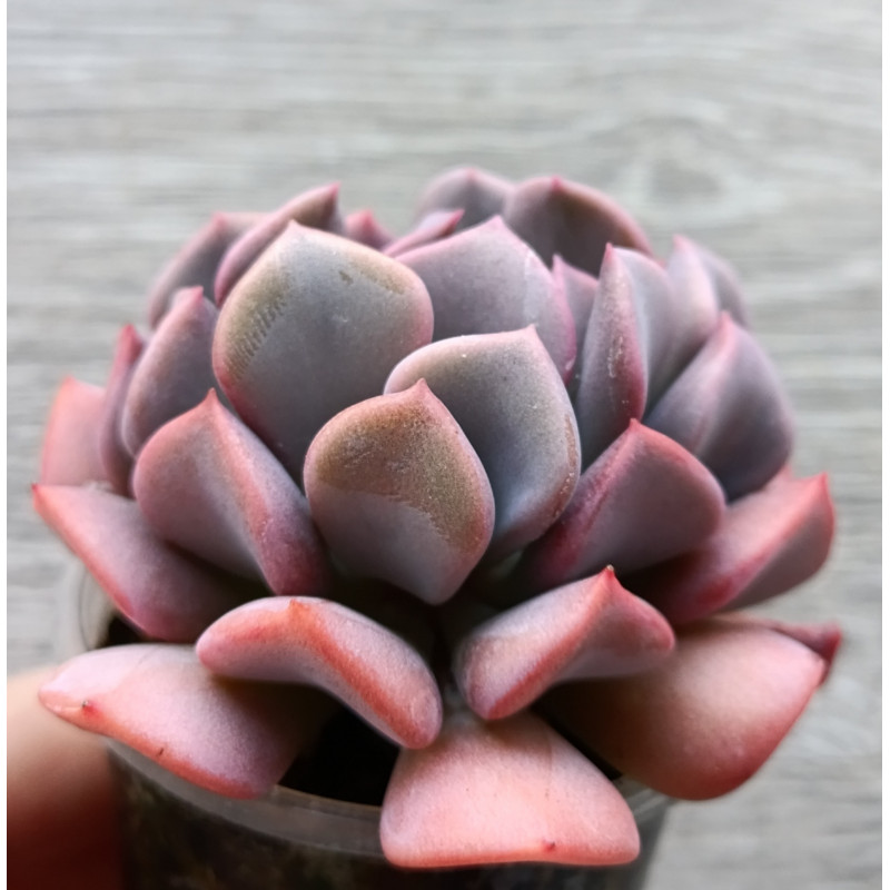 Эхеверия с изящными листьями, которые изгибаются к центру розетки. Цвет от зеленого с сиреневым отливом до розового по краям листьев ближе к центру. Вырастает достаточно крупной.