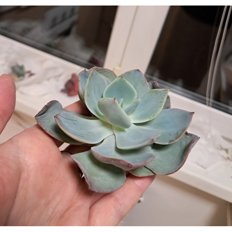 Крупная розетка с умеренно сочными, широкими листьями с налетом. В жестких условиях лист может слегка пожелтеть, а каемка - порозоветь. Цена за черенок 5 см.