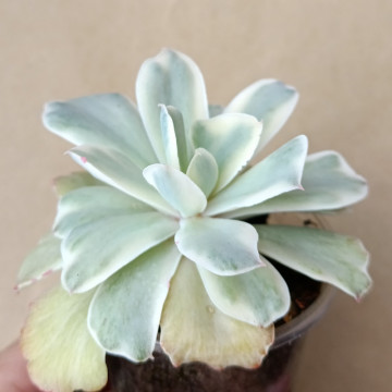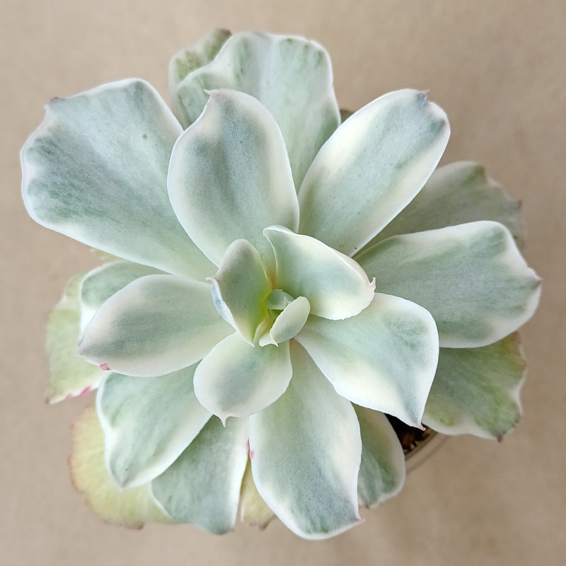 Красивая эхеверия зелено-желтых оттенков с небольшой розовинкой. Листья крупные, длинные, "рваные" по краю.