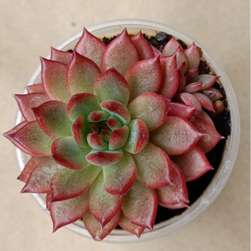 Эхеверия с листьями вытянутой формы и колючкой на кончике. Цвет листьев от зелёного до ярко-красного. Красный цвет более интенсивен к краям и кончикам листа. Яркость зависит от освещения, редкого полива и бедного грунта. На фото 4 пример моего растения. Так же продаётся под названием 'Lejon'.