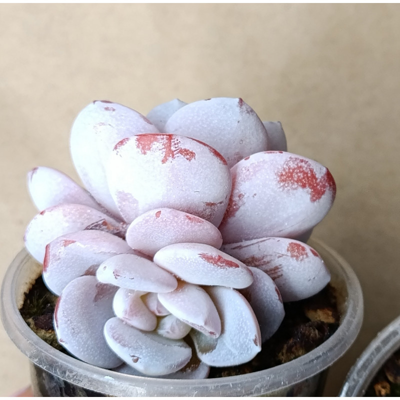 Одна из самых привлекательных эхеверий. Листья округлые, пухловатые с очень густым белым налётом. За счёт налёта цвет может быть розовато-сиреневатым. Требует очень бережного отношения, любое прикосновение стирает часть налёта.