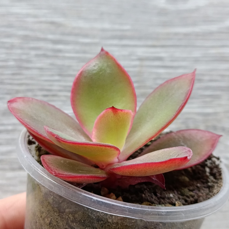 Эхеверия с крупными листьями. Розетка не плотная. Цвет листьев жёлто-зелёный переходящий ярко-красный к краю листа.