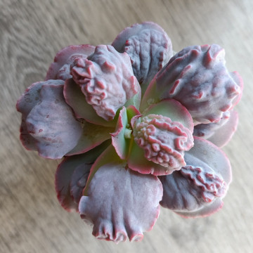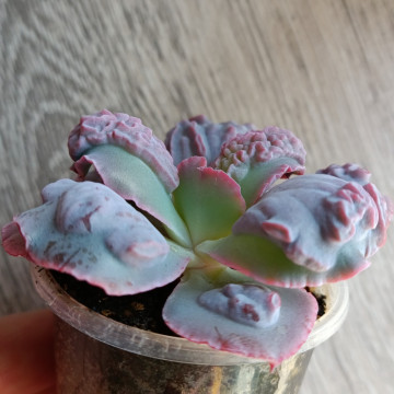 Эхеверия с наростами на листах. Нарост образован мелкими бугорками. Листья раскидистые, вытянутой формы. Цвет от зелёного до сиреневого с розовинкой.