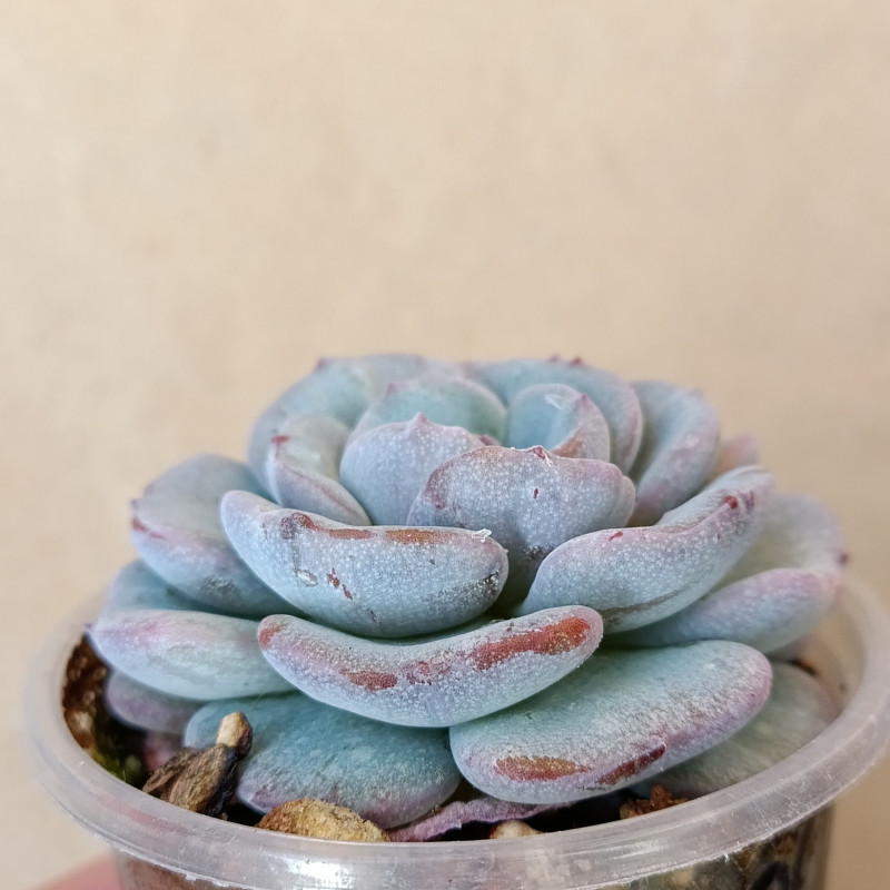 Красивая эхеверия с достаточно плоской розеткой. Листья голубоватого цвета, край листа розово-сиреневый.