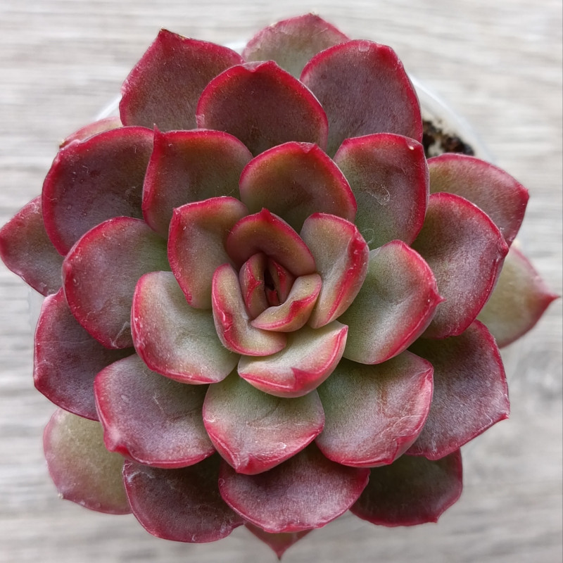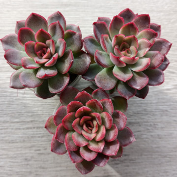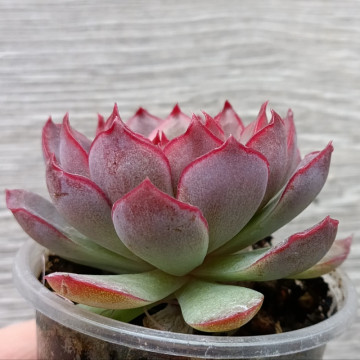 Эхеверия с листьями вытянутой формы. Цвет каемки становится алым при хорошем освещении. Лист немного волнистый.