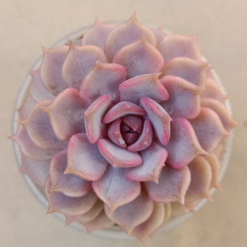 Эхеверия с небольшими вытянутыми листиками и плотной розеткой. Центр розетки малиновый постепенно переходящий в светло-зеленый. Не склонна к вытягиванию.