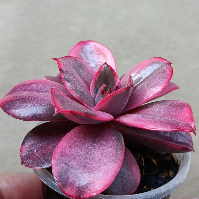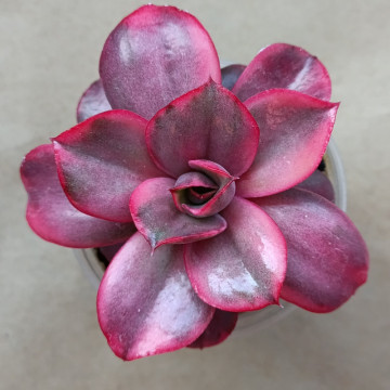 Эхеверия с листом необычной формы. Листья тонкие, но достаточно плотные, твёрдые, подкручиваются по краям. Цвет листьев неоднородный - зелёный, кремовый, розовый, алый с размытыми переходами. Лист глянцевый, гладкий.