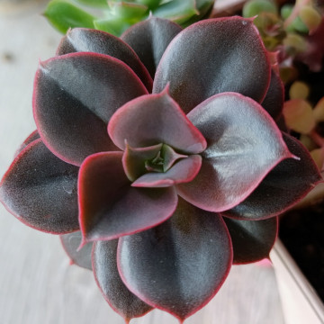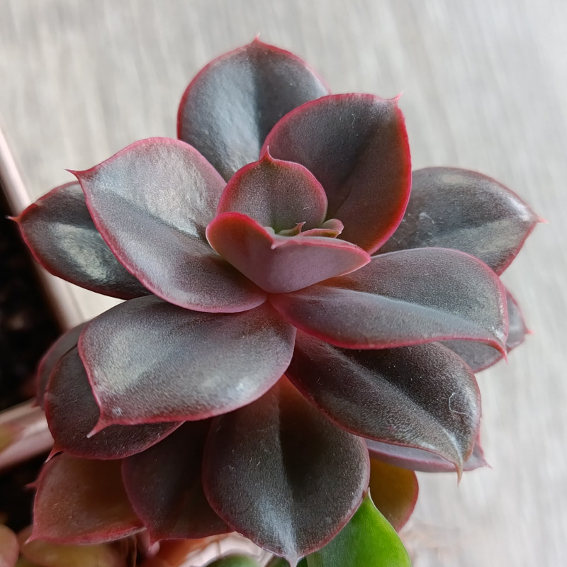 Эхеверия с листом необычной формы. Листья тонкие, но достаточно плотные, твёрдые, подкручиваются по краям, глянцевые. Цвет от зелёного до бордового. Со временем отращивает "ногу".