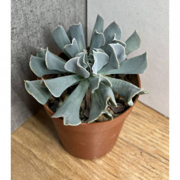 Эхеверия с изящно изогнутыми листьями и заострённым кончиком. Цвет листьев серебристо-зеленый, при хорошем освещении нижние листья приобретают розовато-сиреневые оттенки.