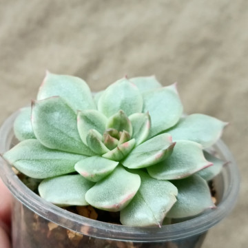 Эхеверия с мясистыми, пёстрыми бело-зелеными листиками вытянутой формы. Розовый оттенок приобретает при чуть более ярком освещении. Такую окраску называют "платинум".