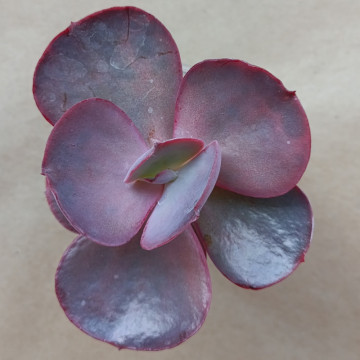 Эхеверия с крупными плоскими листьями. Цвет листа зелёный от центра переходящий в зелено-бордовый. Каёмка листа ярко-красная. Плотность розетки и её цвет зависит от яркости освещения.
