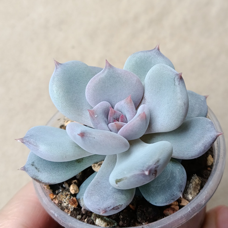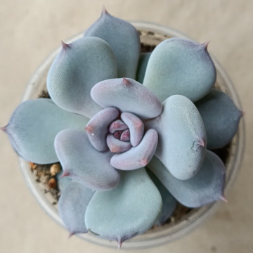 Эхеверия с цветом листьев от зелёного до сиреневого к центру. Имеет небольшой белый налёт. Форма листика резко заострённая к кончику. На фото 1 пример моего растения.