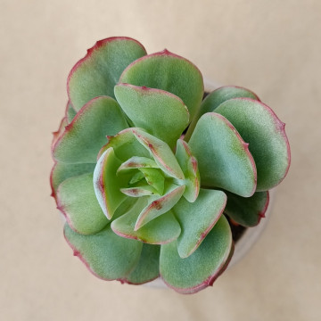 Эхеверия необычного нежно-зеленого цвета. Листья плоские, округлые с небольшой колючкой на кончике, цвет листика возле колючки может быть желто-красным. При хорошем освещении, розетка со временем становится похожа по форме на бутон пиона. Розетка не плотная.