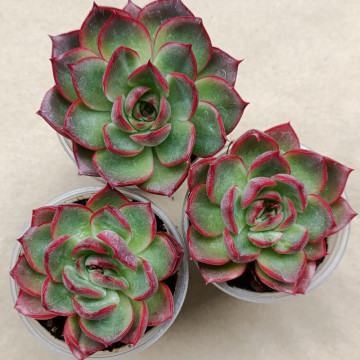Эхеверия, напоминающая по форме бутон. Изящные листики заострены на кончике. Привлекательна ярко-красной окантовкой листа. Внешняя сторона листа также красная, ближе к кончику более насыщенный цвет.