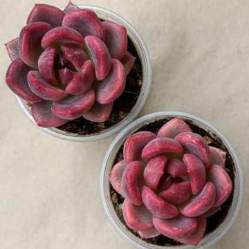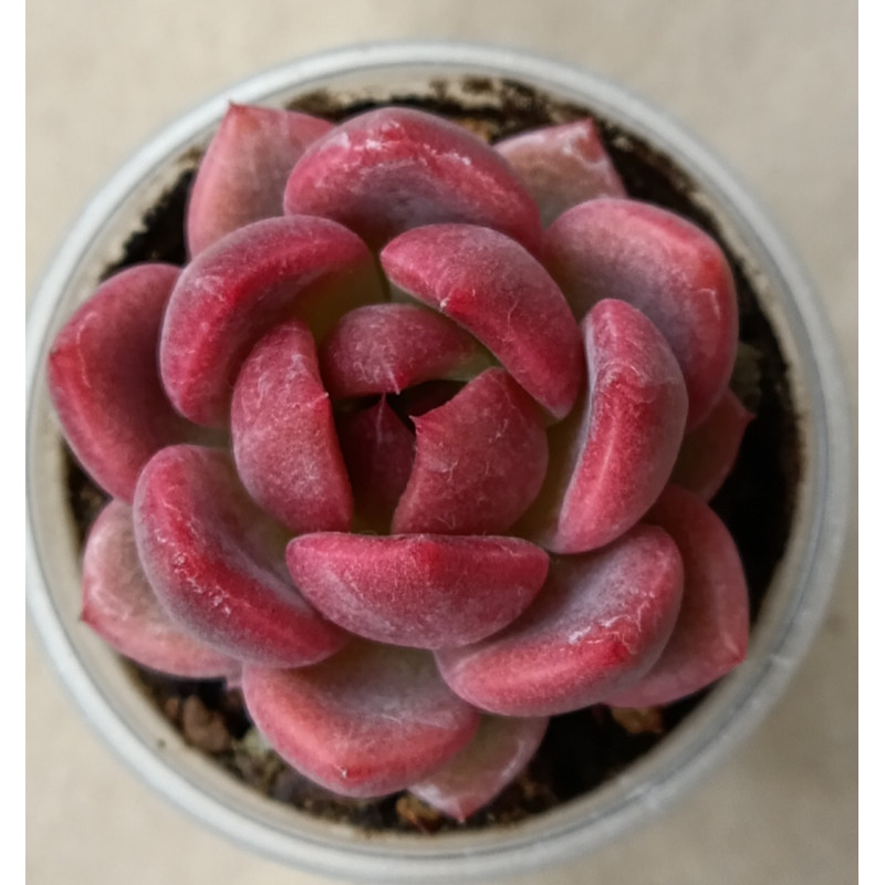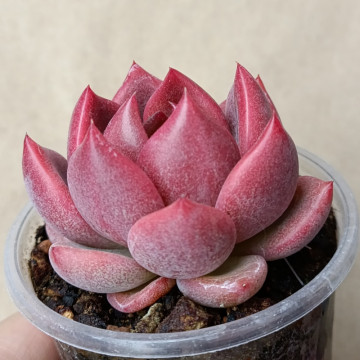 Красивая эхеверия в розово-зеленых тонах. При ярком освещении становится темно-розовой и появляются светлые грани. Листья мясистые, розетка не склонна вытягиваться.