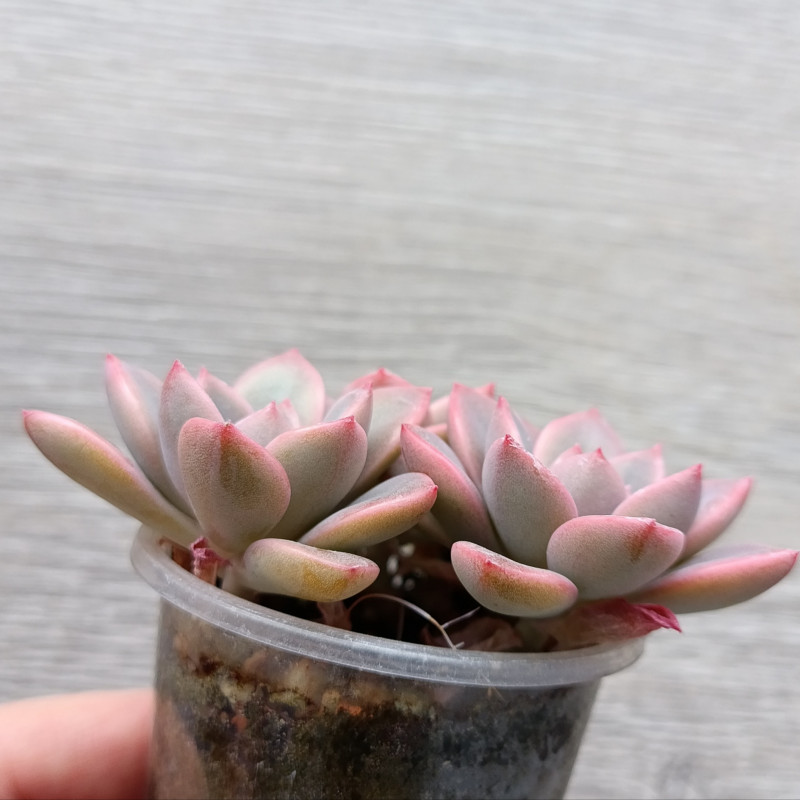 Красивая эхеверия в розово-зеленых тонах. При ярком освещени, редком поливе и в минеральном грунте становится насыщенно розовой. Листики мясистые, кончики треугольной формы.