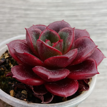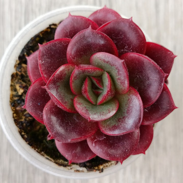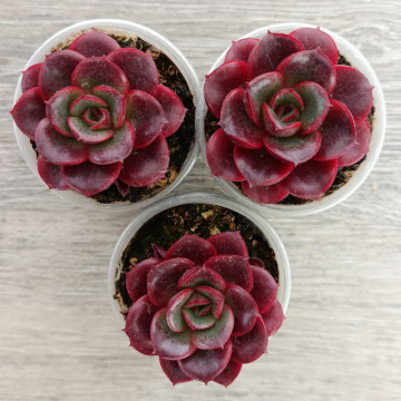 Эффектное растение с глянцевыми листиками. Нижние листики окрашиваются в тёмно-красный, начиная с кончиков к серединке. Красный цвет неоднородный - крапинками. В центре, сверху розетки лист тёмно-зелёный. Листики имеют красную окантовку.