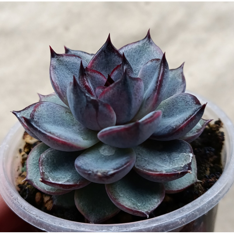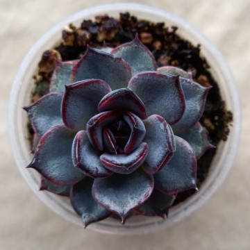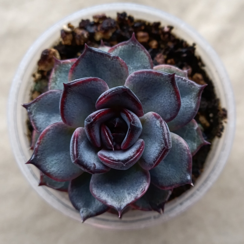 Эхеверия с плотной розеткой. Лист у основания зелёный, каемка окрашена в красно-коричневый. Серединка эхеверии темно-черничная. На внешней стороне листа посередине более тёмная полоска.