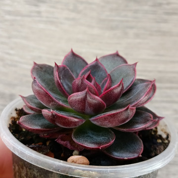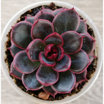 Красивая эхеверия с плотной розеткой. Середина розетки насыщенного свекольного цвета. К краям листики могут быть темно-зелеными. С возрастом приобретает беловатый налёт, который создаёт неповторимый узор на каждой розетке. Не склонна к вытягиванию.