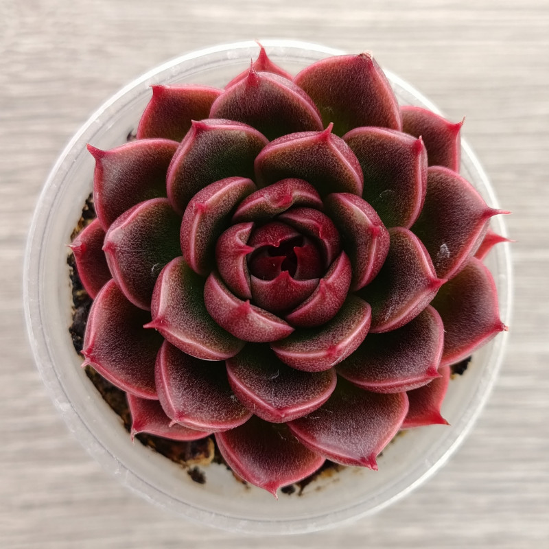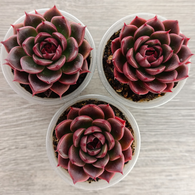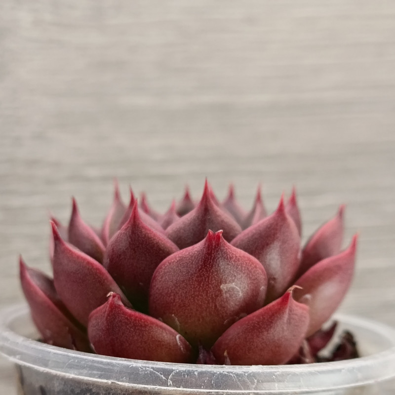 Эффектная эхеверия с плотной розеткой. Листья глянцевые, край листа бодовый, середина тёмно-зелёная с бордовым отливом. При ярком освещении бордовый цвет становится преобладающим. Не склонна к вытягиванию.