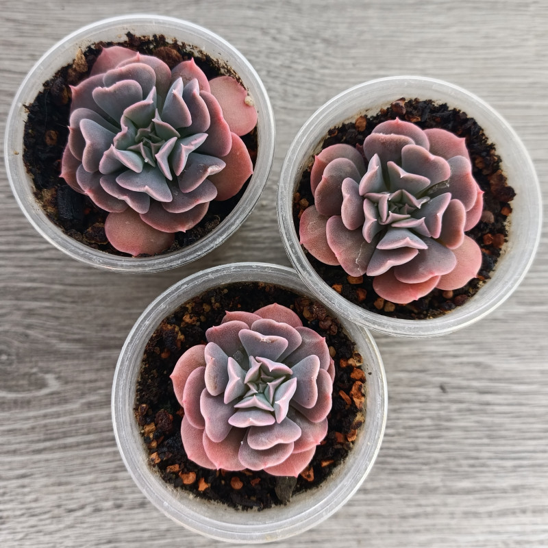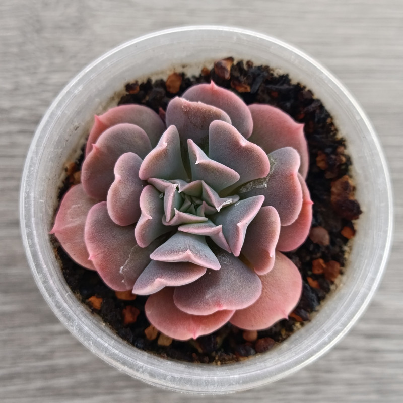 Эхеверия с изящно изогнутыми листьями. Цвет листьев при ярком освещении приобретает фиолетово-розовые оттенки.