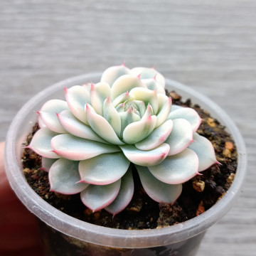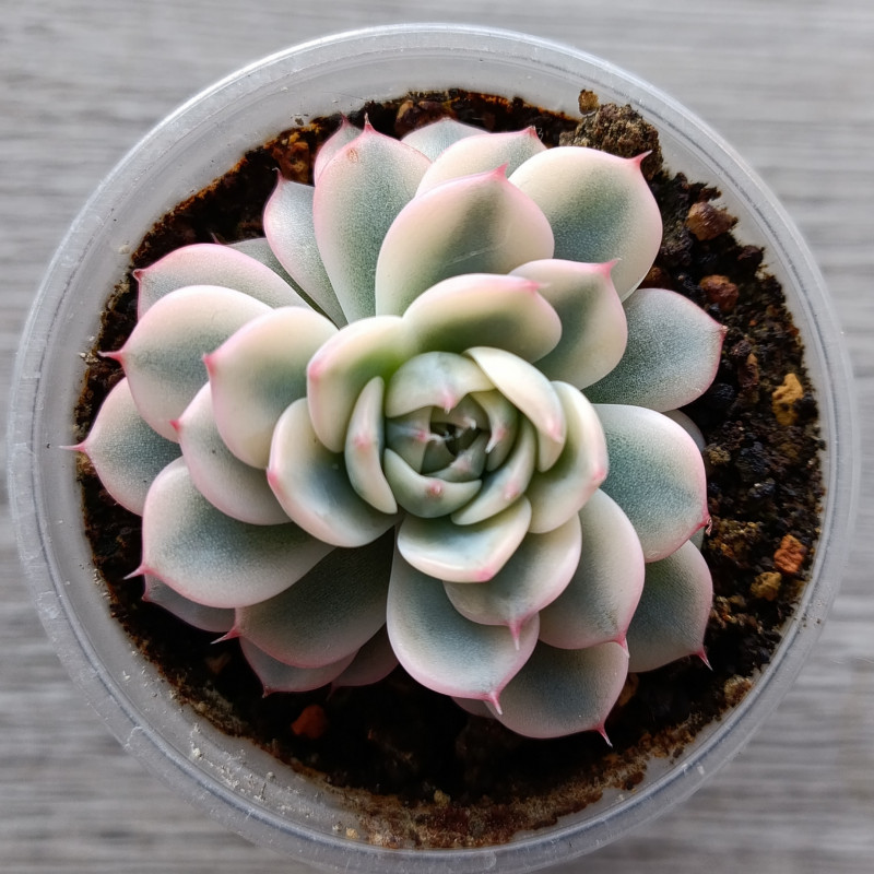 Эхеверия с небольшой плотной розеткой из мелких листочков. Края листьев молочного цвета, серединка - зелёная. Колючка на кончике и самый край листа с лёгкой розовинкой.