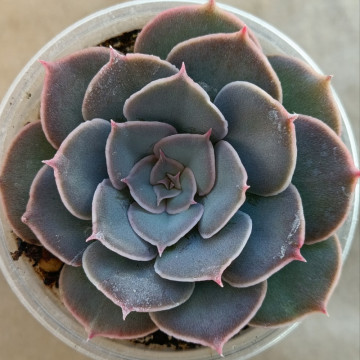 Эхеверия с множеством тонких, плотно сидящих листьев. Край листа волнистый и чуть светлее цвета розетки.