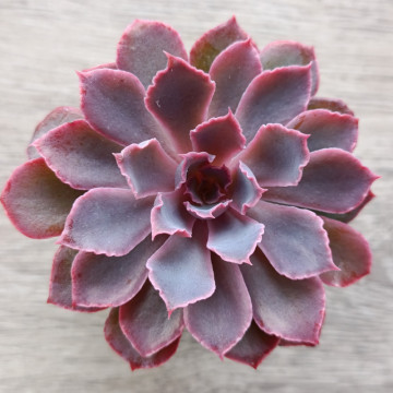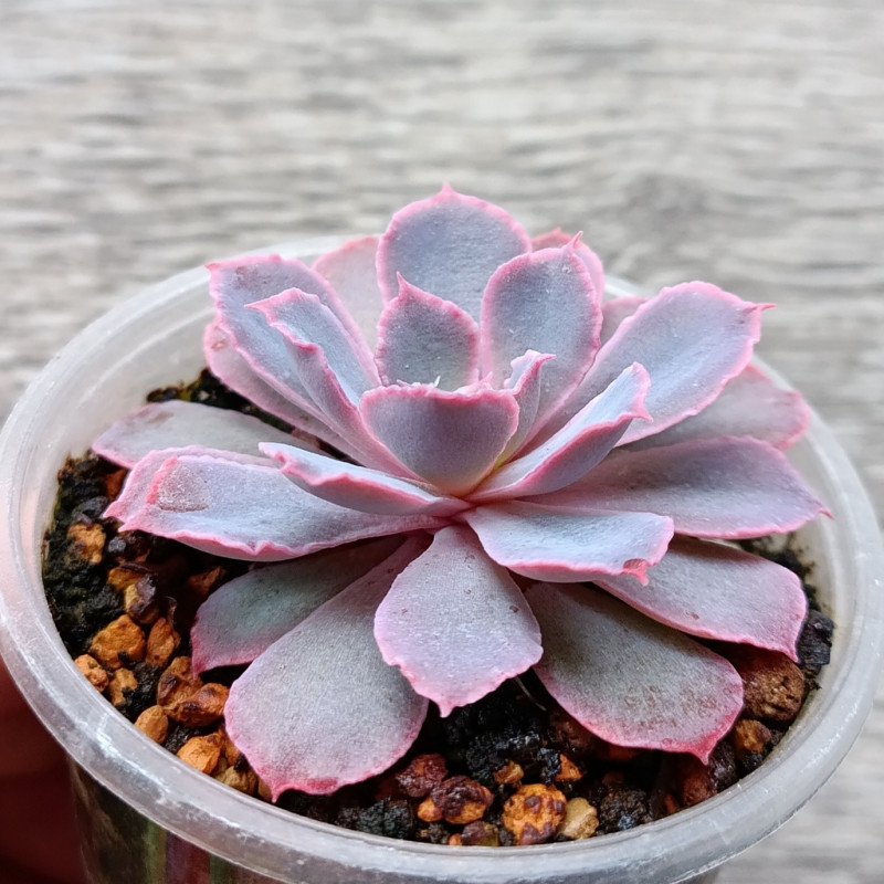 Эхеверия с множеством тонких, плотно сидящих листьев. Край листа волнистый. Цвет растения нежно-сиреневый.