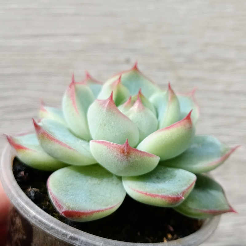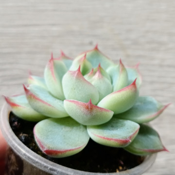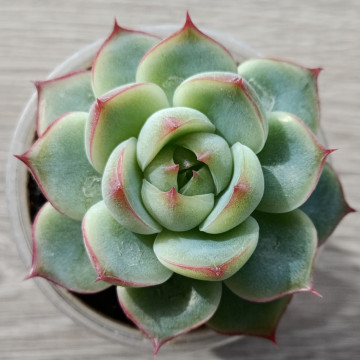 Эхеверия с красивой розеткой классической формы. Листья светло-зелёного цвета с розовой каемкой.