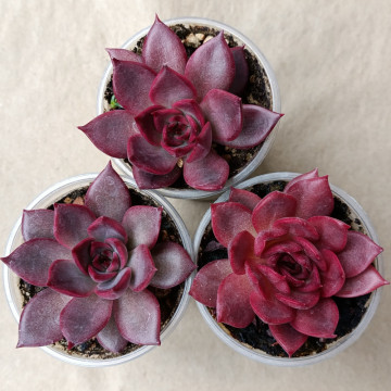 Яркая, бордово-красная эхеверия. Форма розетки классической формы. Листья к кончикам треугольной формы, чуть изогнуты, образуют красивый бутон. Не склонна к вытягиванию, хорошо окрашивается. Внутри розетки около основания листиков присутствует зелёный цвет.