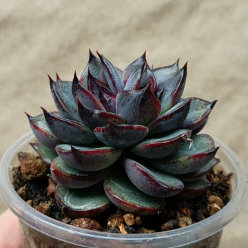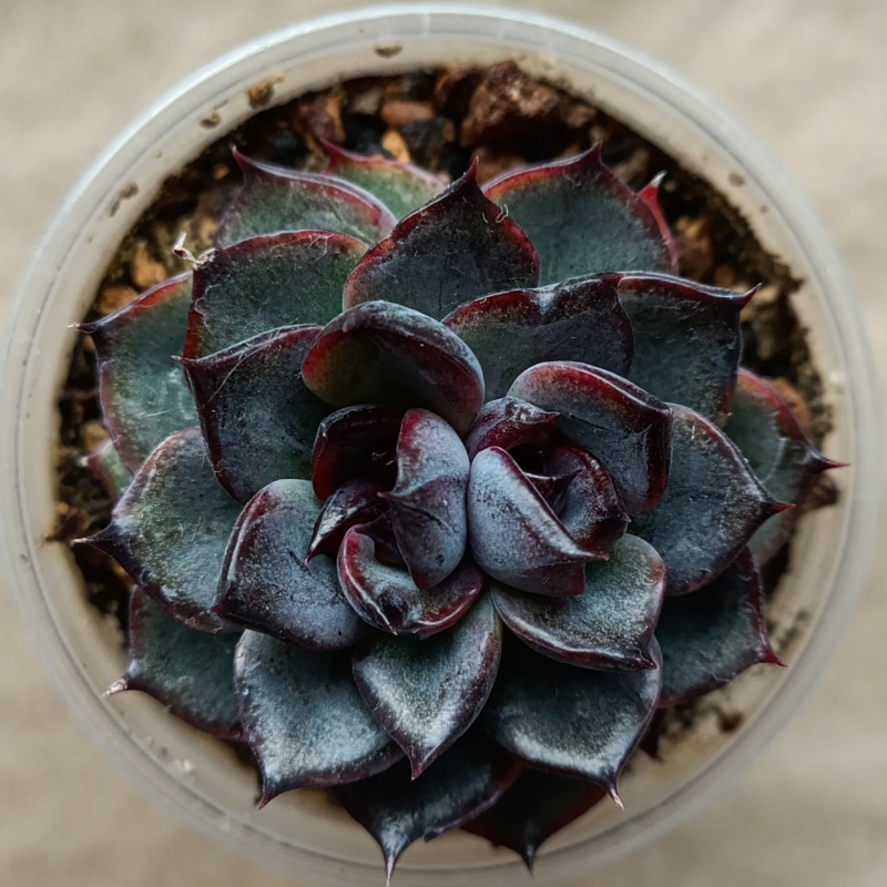 Эхеверия с плотной розеткой. Лист у основания зелёный, к кончикам окрашен в красно-коричневый. На внешней стороне листа посередине более тёмная полоска. Середина розетки тёмно-фиолетовая.