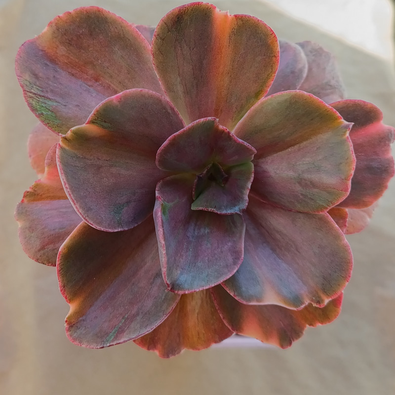 Эхеверия с крупной розеткой. Лист с прожилками разных цветов, светло-зелёный, тёмно-зелёный, розовый, золотистый.