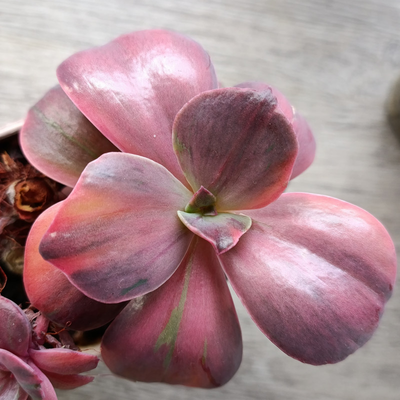 Эхеверия с крупной розеткой. Лист с прожилками разных цветов, светло-зелёный, тёмно-зелёный, розовый, золотистый.